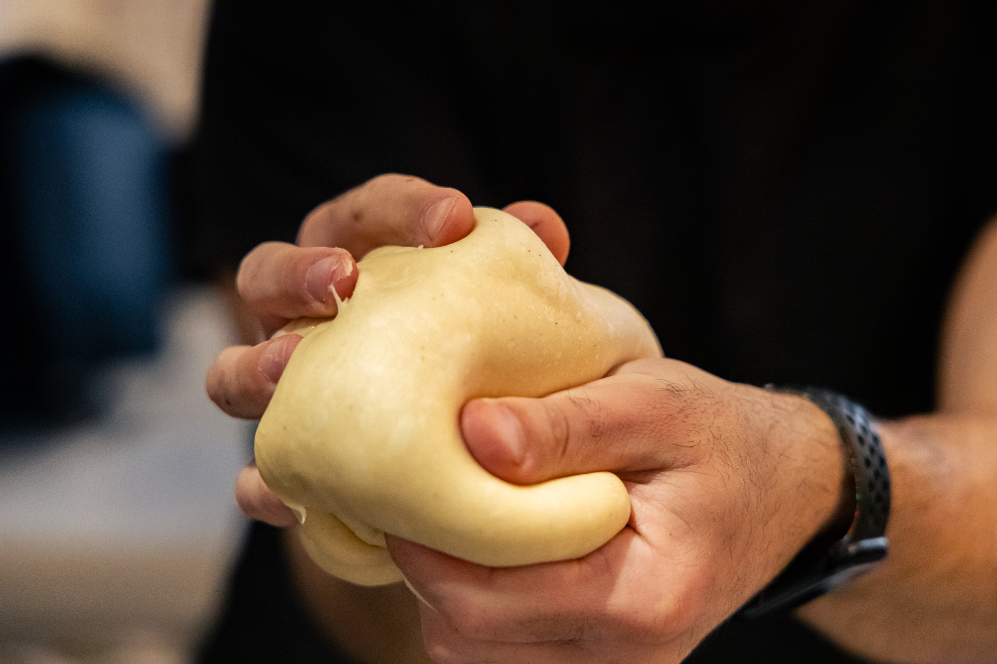 Le chef la travaille et la divise en plusieurs petites boules qu'il dispose sur une plaque. Elles seront placées dans une chambre de pousse, six à sept heures.