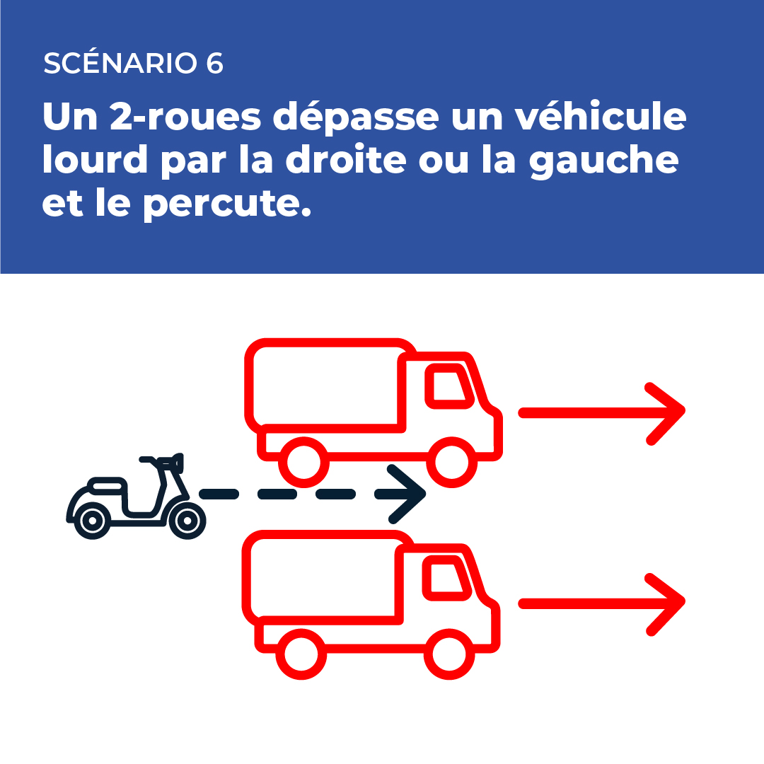 Situation 6 : un 2-roues dépasse un véhicule lourd par la droite ou la gauche et le percute