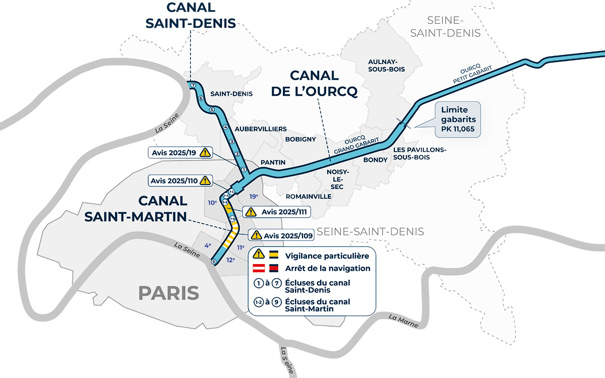 Les usagers du canal Saint-Martin sont informés d'une opération de maintenance préventive des centrales hydrauliques des écluses 1-2 de la Villette entraînant un arrêt de la navigation dans ce site les lundis 1er, 8 et 15 décembre 2025 de 8h30 à 9h30. Cet arrêt de la navigation concerne uniquement les écluses 1-2.
