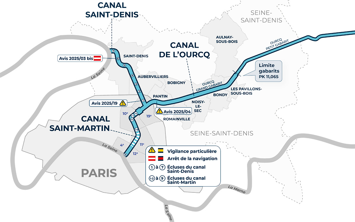 Les usagers du canal de l'Ourcq à grand gabarit sont informés que dans le cadre de la création d'un ouvrage de franchissement, une opération de levage au-dessus du chenal de la navigation est prévu du mardi 20 janvier à 23h00 jusqu'au mercredi 21 janvier 2026 à 8h. Pour cette raison la navigation sera interrompue dans cette zone et pendant toute cette période.
