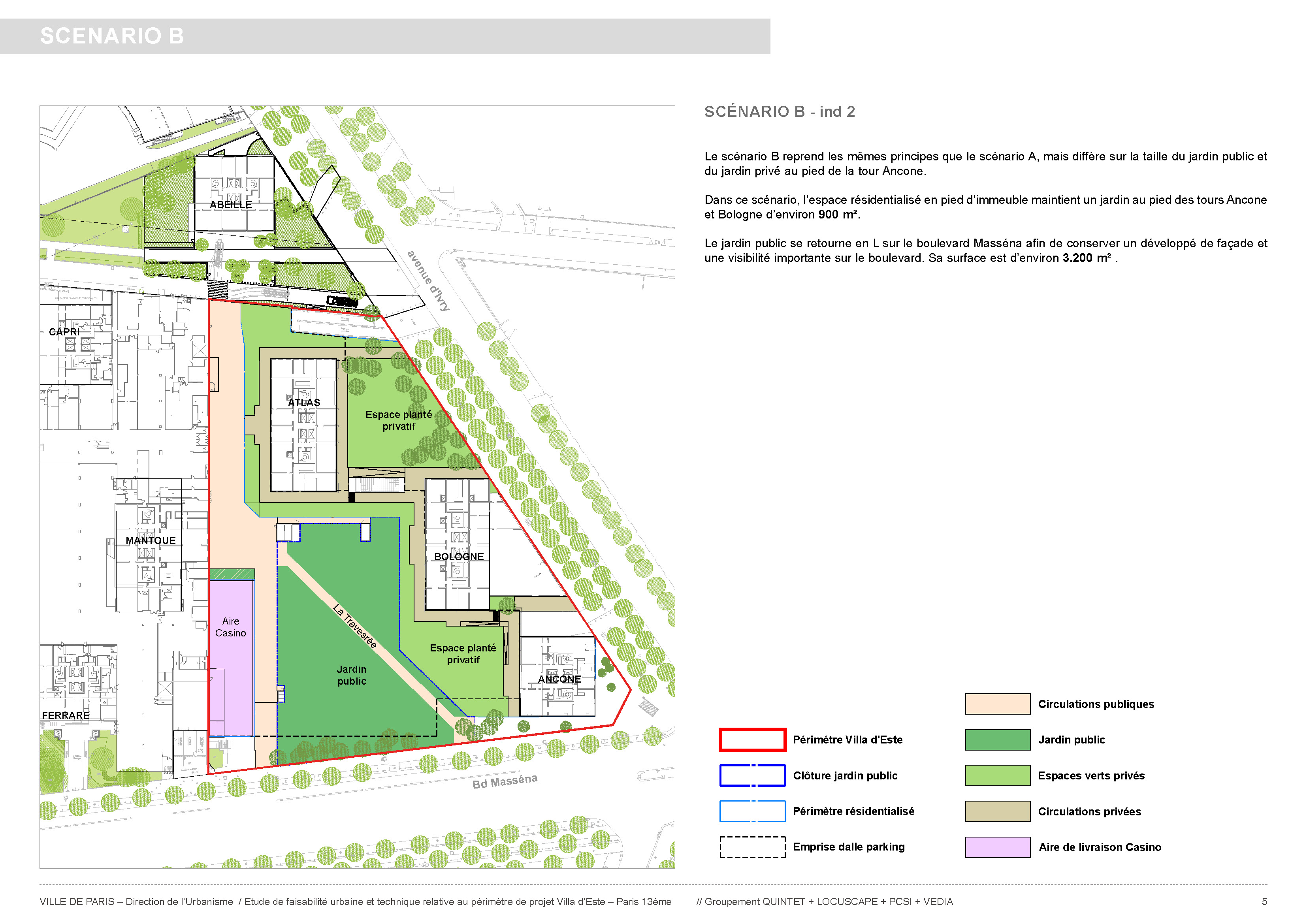 Situé dans le 13e arrondissement, ce secteur a fait partie de l’opération "Italie" réalisée dans les années 1970. La Ville de Paris, en lien avec le conseil syndical et le syndic de la copropriété, souhaite réaménager le périmètre Villa d’Este, caractéristique d'un urbanisme sur dalle, pour requalifier les espaces ouverts au public et créer un nouvel espace vert.